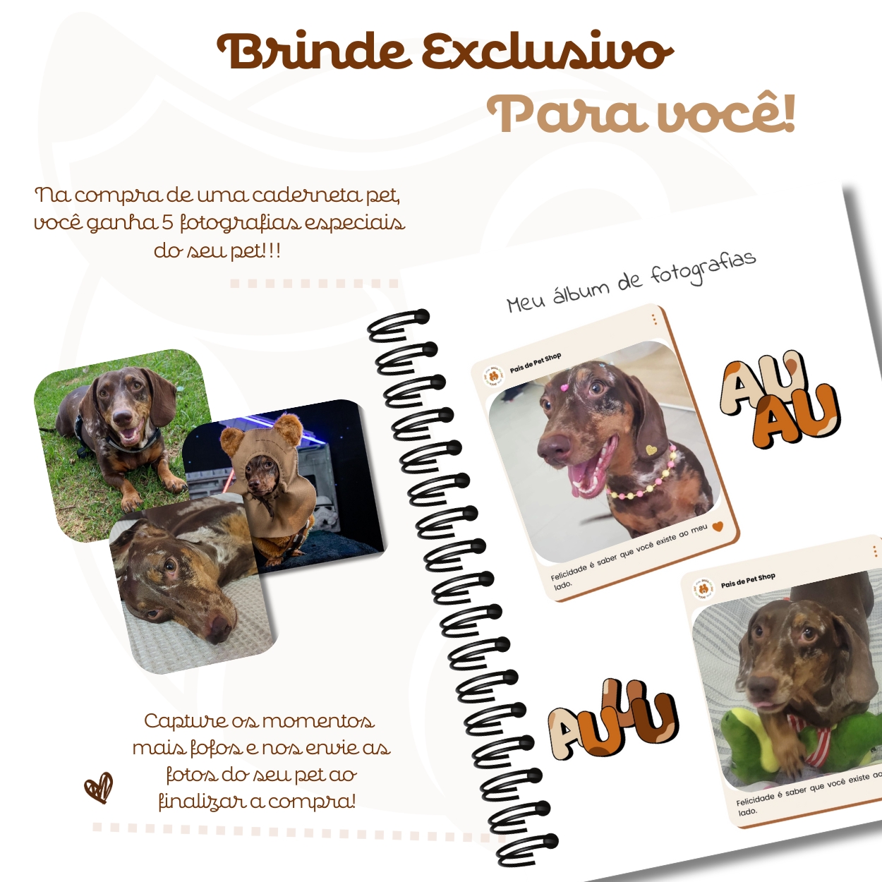 Diferente das cadernetas tradicionais com imagens genéricas, aqui o seu pet é retratado de forma única.